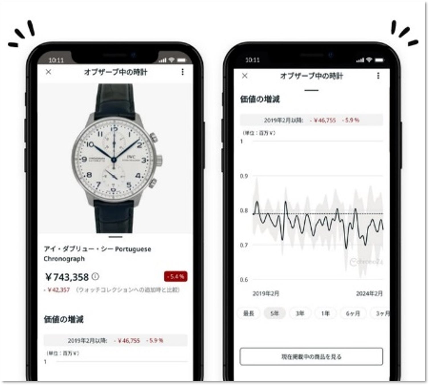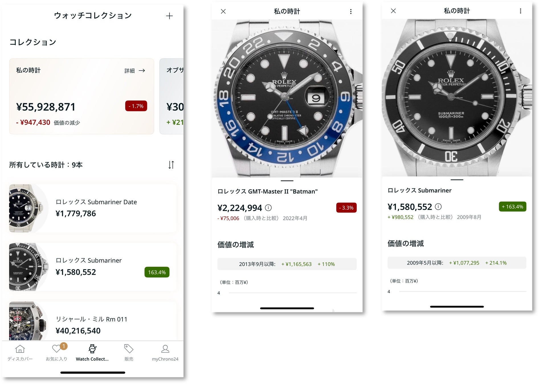 Chrono24では、お手持ちの時計や気になっている時計の価値の増減を常に確認できる「ウォッチコレクション」という機能をChrono24ウェブサイト、及びアプリにて備えており、世界各地の130万人を超える時計好きの皆様にご利用いただいています。本機能は、Chrono24が世界最大級の高級時計マーケットプレイスとして所有する膨大な時計のデータを活用し、時計に興味を持つすべての皆様にとって便利で有益なツールを作りたいという思いから開発されました。