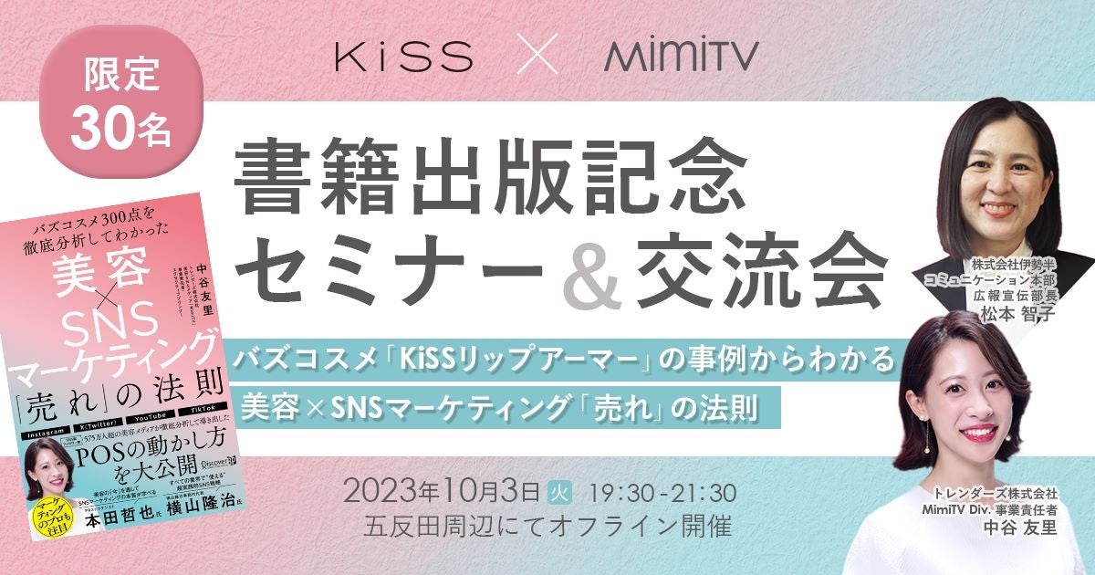 また、出版を記念して、株式会社伊勢半の松本氏をゲストに迎え、セミナーおよび交流会を開催します。セミナーでは、本書の内容をご紹介しつつ、バズコスメ「KiSS リップアーマー」を事例に「SNS売れ」の仕組みに迫ります。交流会では、軽食とドリンクをご用意します。ご参加者同士のフラットなコミュニケーションに加え、本書の著者でありMimiTV事業責任者の中谷およびMimiTVプランナーに直接ご質問、ご相談いただくことも可能です。