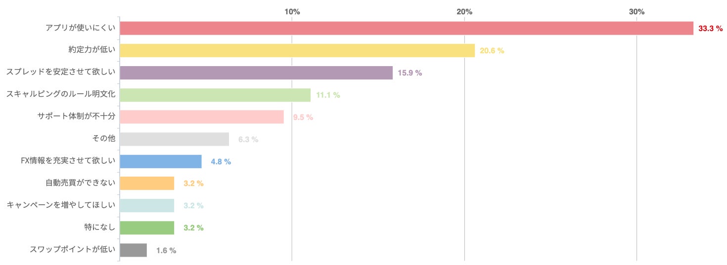 次いで、「約定力の低さを改善してほしい(20.6%)」「スプレッドが拡大しやすいので安定させて欲しい(15.9%)」「禁止されているスキャルピングの規定を明文化してわかりやすくして欲しい(11.1%)」などを希望するユーザーも多かった。