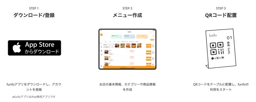 「funfo」は、1台の iPad+数枚の紙(QR コード印字)で飲食店の店内モバイルオーダーを簡単に実現することができます。基本使用料は無料で、中小規模の飲食店でも手軽にモバイルオーダーを開始できます。
