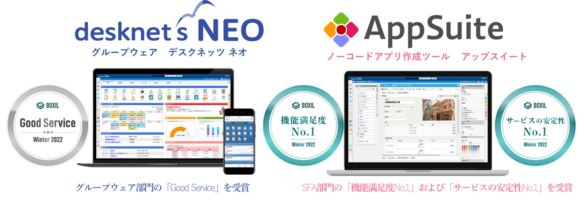 株式会社ネオジャパン(本社:神奈川県横浜市、代表取締役社長:齋藤 晶議)はスマートキャンプ株式会社(以下、スマートキャンプ)が今最も評価されているSaaSを表彰する「BOXIL SaaS AWARD Winter 2022」のグループウェア部門において『desknet's NEO(デスクネッツ ネオ)』が「Good Service」を、SFA(営業支援システム)部門において『AppSuite』が「機能満足度No.1」および「サービスの安定性No.1」を受賞したことをお知らせします。