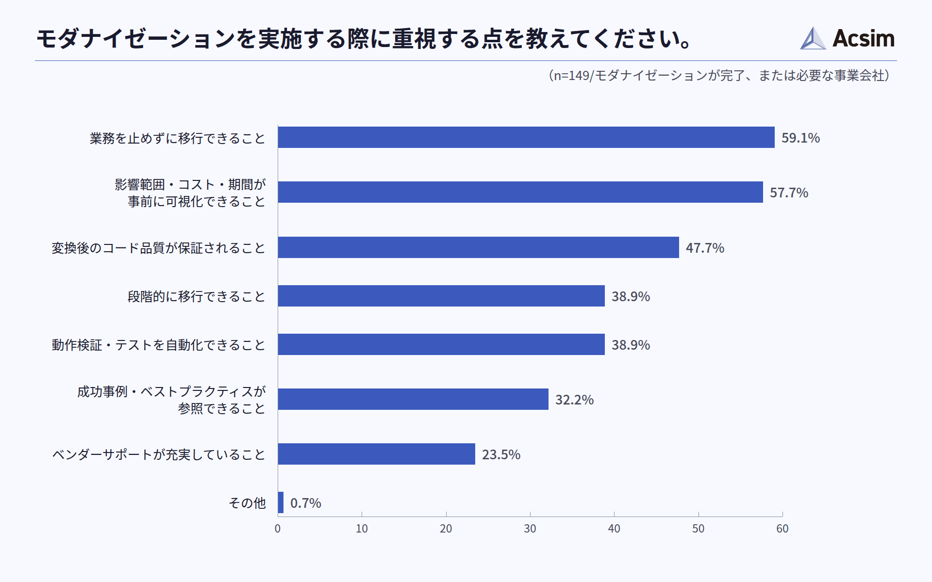 モダナイゼーションで重視する点を尋ねたところ、「業務を止めずに移行できること」が59.1%で最も多く、「影響範囲・コスト・期間を事前に可視化できること」が57.7%、「変換後のコード品質が保証されること」が47.7%と続き、移行の安全性と事前の見通しを重視する傾向がみられました(n=149/モダナイゼーションが完了、または必要な事業会社)。