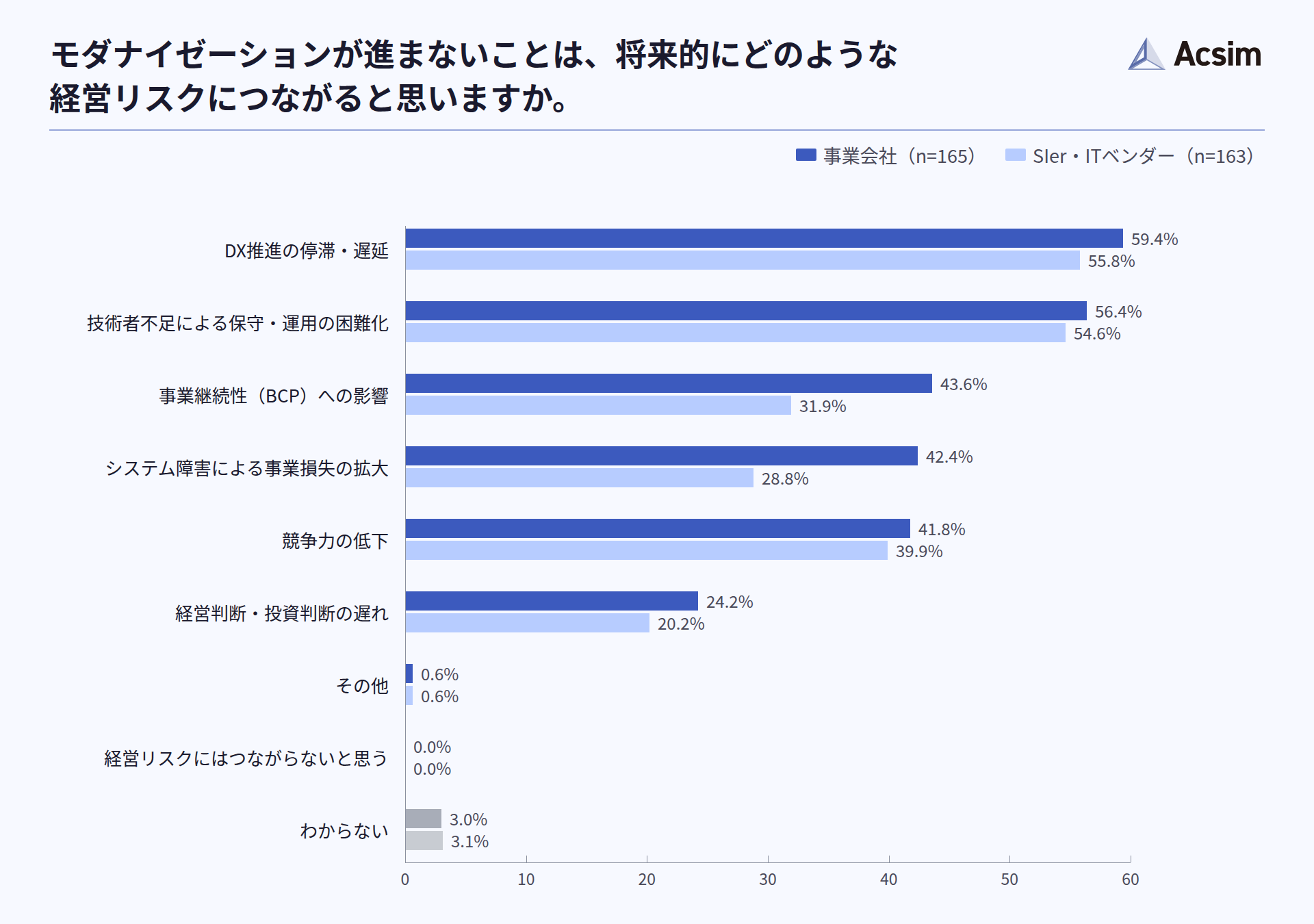 モダナイゼーションが進まない場合の経営リスクを尋ねたところ、事業会社、SIer共に「DX推進の停滞・遅延」、「技術者不足による保守・運用の困難化」が半数を越えており、将来的なリスク認識は双方で共通する結果となりました(n=165/事業会社、n=163/SIer・ITベンダー)。