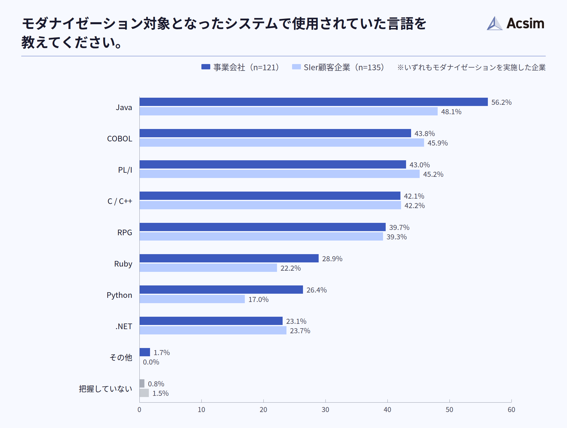 モダナイゼーションの対象は、レガシー言語に限定されず、Javaにも広がっていることがうかがえます(モダナイゼーションを実施した企業/事業会社n=121、SIer顧客企業n=135)。