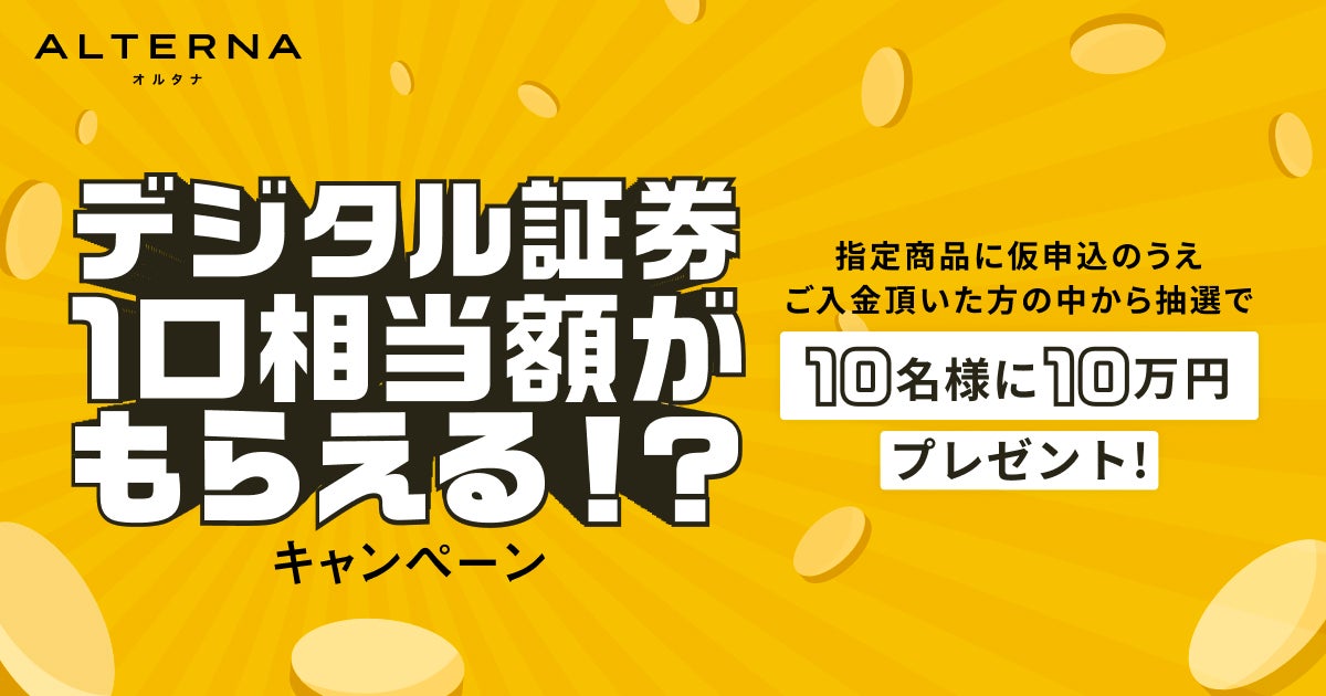当社が提供するデジタル証券を活用したALTERNA(オルタナ)に初めて口座開設した上で、現在募集中の商品に仮申込し、仮申込数量以上の金額を入金いただいたお客様の中から抽選で10名様に本商品1口相当の金額(10万円)をプレゼントします。