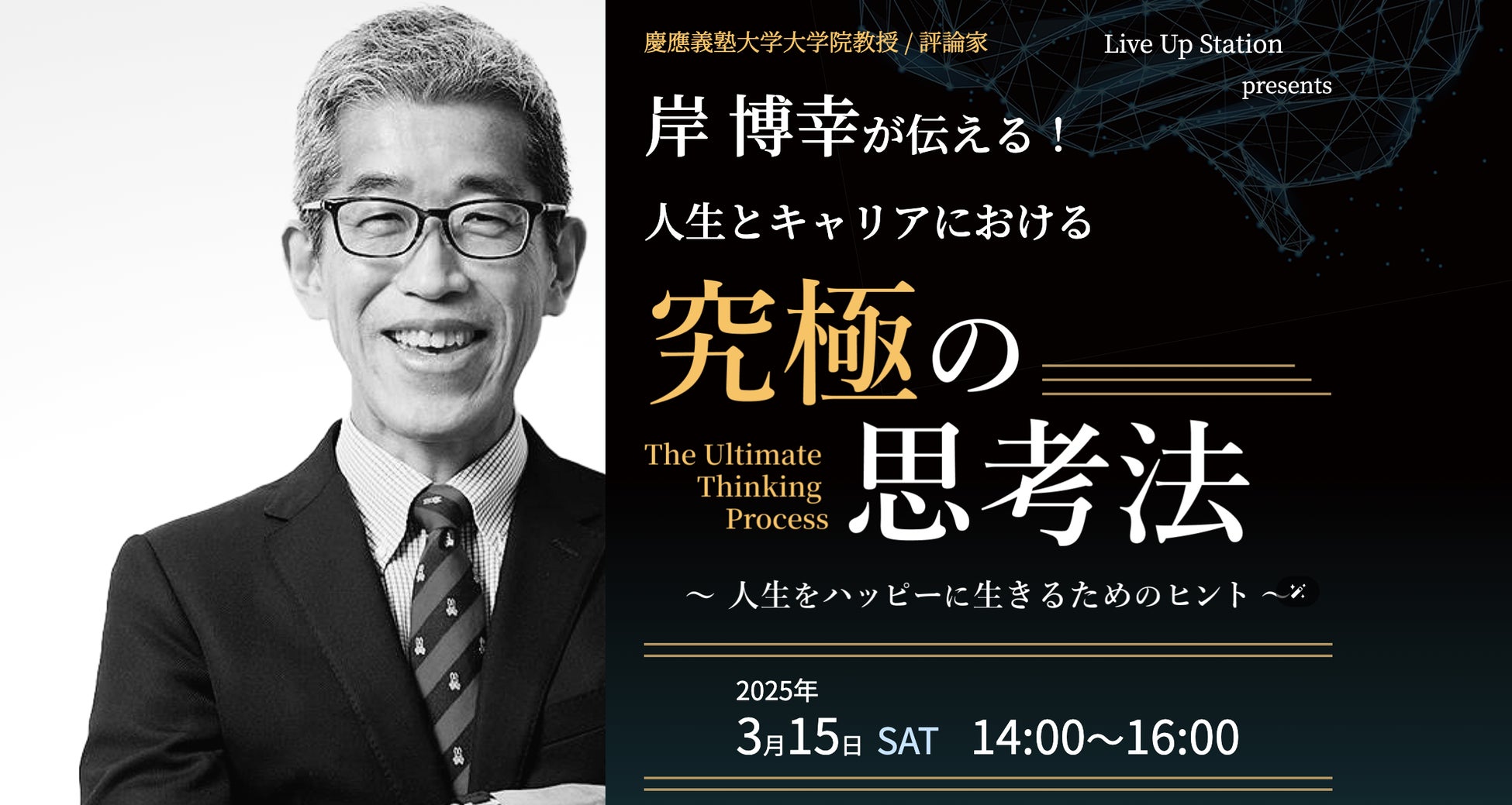 慶応義塾大学大学院教授であり評論家としても活躍する岸氏が語る人生をハッピーに生きるためのヒント。リアルとオンラインのハイブリッドで開催!第3回目以降の豪華ゲスト情報も公開。