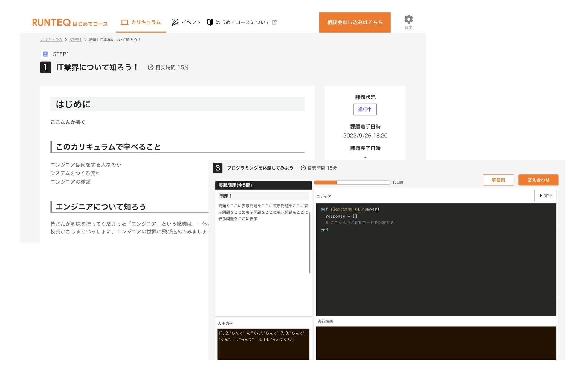 カリキュラム形式はRUNTEQ有料コースと同じものを採用し、動画で学習内容や進め方を丁寧に解説したあと、実際にコードを書いてアウトプットするところまでチャレンジできます。