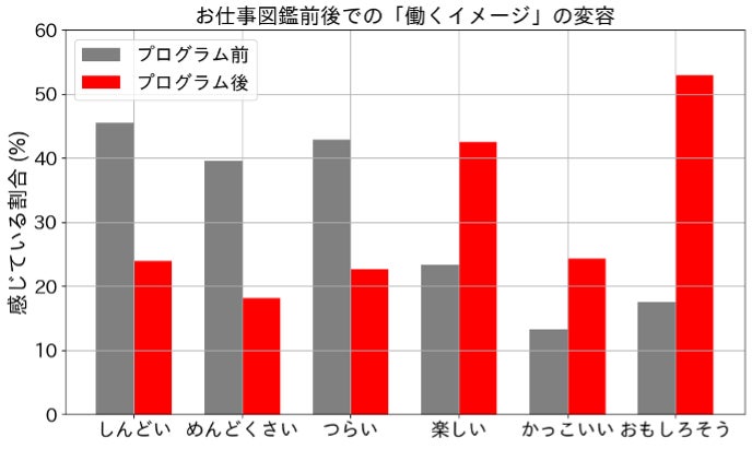お仕事図鑑プログラムを通じて、参加者の働くことに対するネガティブなイメージが低下し、ポジティブなイメージは向上していることが確認されました(有意水準5%、小〜中程度の効果、N=883)。