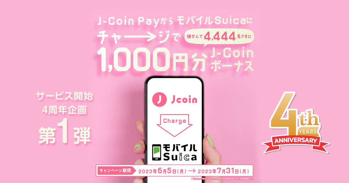 サービス開始4周年を記念した第1弾企画として、「J-Coin Pay モバイルSuicaチャージキャンペーン」を実施します。期間内でのJ-Coin PayからモバイルSuicaへの累計5,000円以上のチャージを対象に、抽せんで4,444名さまに1,000円分のJ-Coinボーナスをプレゼントします。