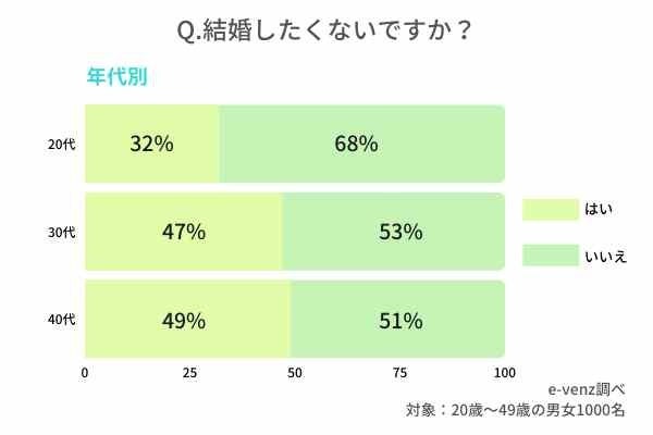 アンケート結果からもわかるように、20代は結婚したくないと答える割合が多く、30代40代も共に結婚したい、したくないが半々の調査結果でした。