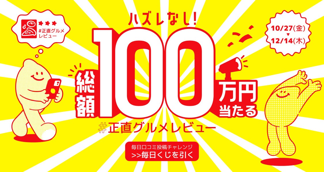 10月27日(金)から総額100万円が当たる「#正直グルメレビュー」投稿キャンペーンを開催中