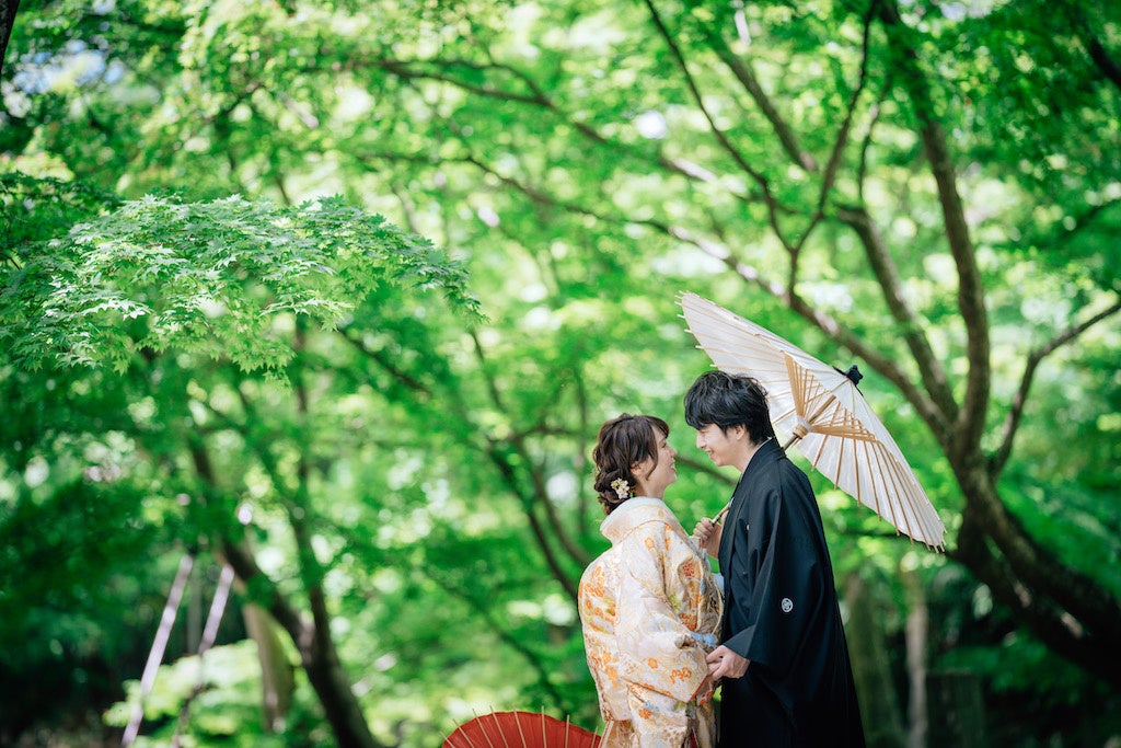 初夏の陽射しをキラキラと反射させる木々の緑が美しいこの季節。夏の始まりを感じさせる陽気とともにおふたりの自然な表情を引き出してくれます。晴れやかな結婚写真との相性もぴったり。