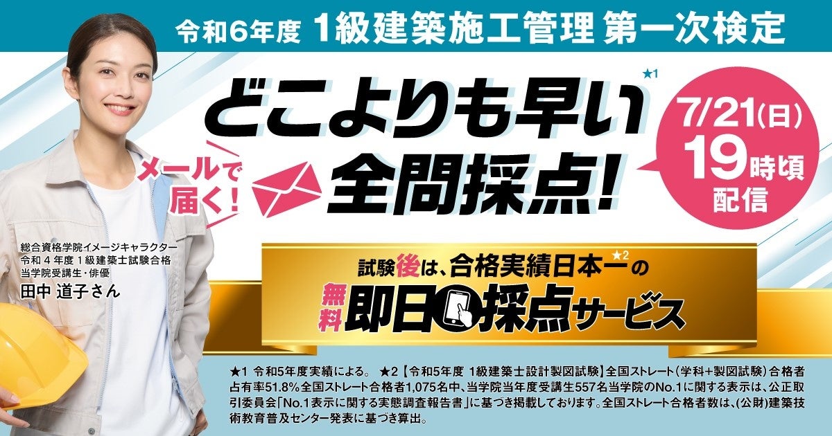 【2024年度 1級建築施工管理技術検定】 無料「即日採点サービス」 試験当日7/21(日)19時~採点結果配信!14時~受付開始【総合資格学院】