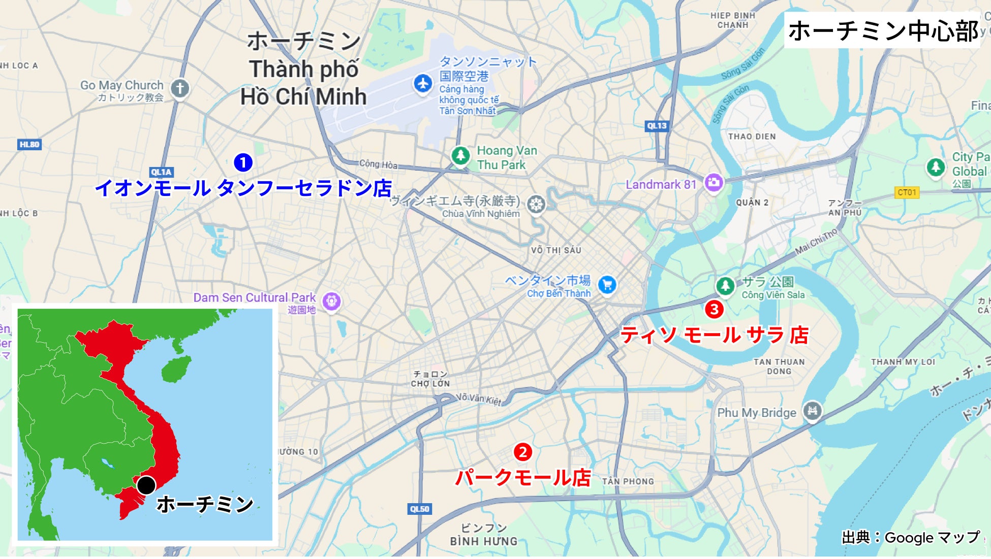 Lot L1-17, Floor 1 Thiso Mall Sala 10 Mai Chi Tho street, An Khan Ward, Ho Chi Minh city, Vietnam.
