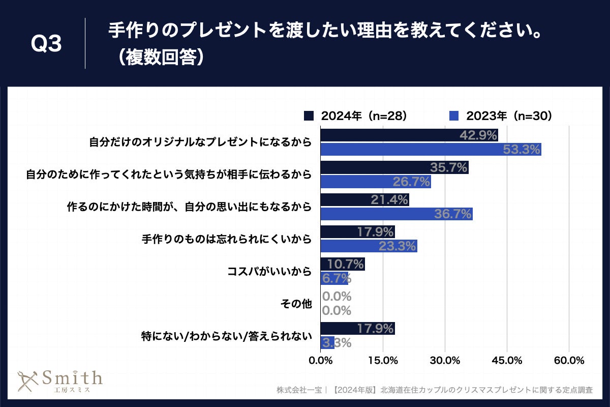 Q1で「非常にそう思う」「ややそう思う」と回答した方に、「Q3.手作りのプレゼントを渡したい理由を教えてください。(複数回答)」(n=28)と質問したところ、「自分だけのオリジナルなプレゼントになるから」が42.9%、「自分のために作ってくれたという気持ちが相手に伝わるから」が35.7%、「作るのにかけた時間が、自分の思い出にもなるから」が21.4%という回答となりました。