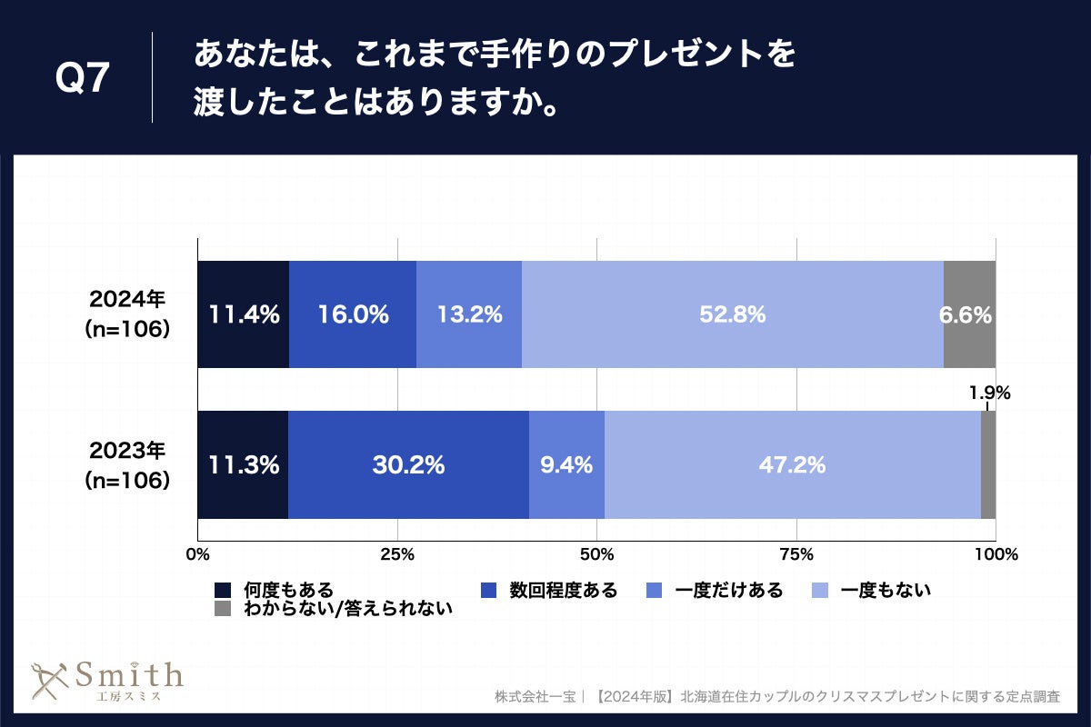 「Q7.あなたは、これまで手作りのプレゼントを渡したことはありますか。」(n=106)と質問したところ、「何度もある」が11.4%、「数回程度ある」が16.0%という回答となりました。