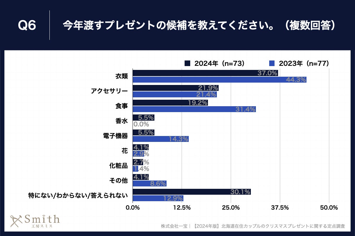 Q1で「あまりそう思わない」「全くそう思わない」と回答した方に、「Q6.今年渡すプレゼントの候補を教えてください。(複数回答)」(n=73)と質問したところ、「衣類」が37.0%、「アクセサリー」が
