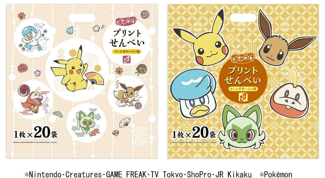 本商品のパッケージデザインには「和」をテーマにしたスタイルガイドを使用し、ピカチュウ、イーブイ、ニャオハ、ホゲータ、クワッスが目を引くデザインに仕上げました。パッケージのデザインは全2種、手提げ袋タイプですので持ち運ぶ際も便利な商品です。中身は、とうもろこしの甘さと濃厚でやさしい味わいがお子様から大人まで大人気の「コーンポタージュ味」のソフトせんべいです。