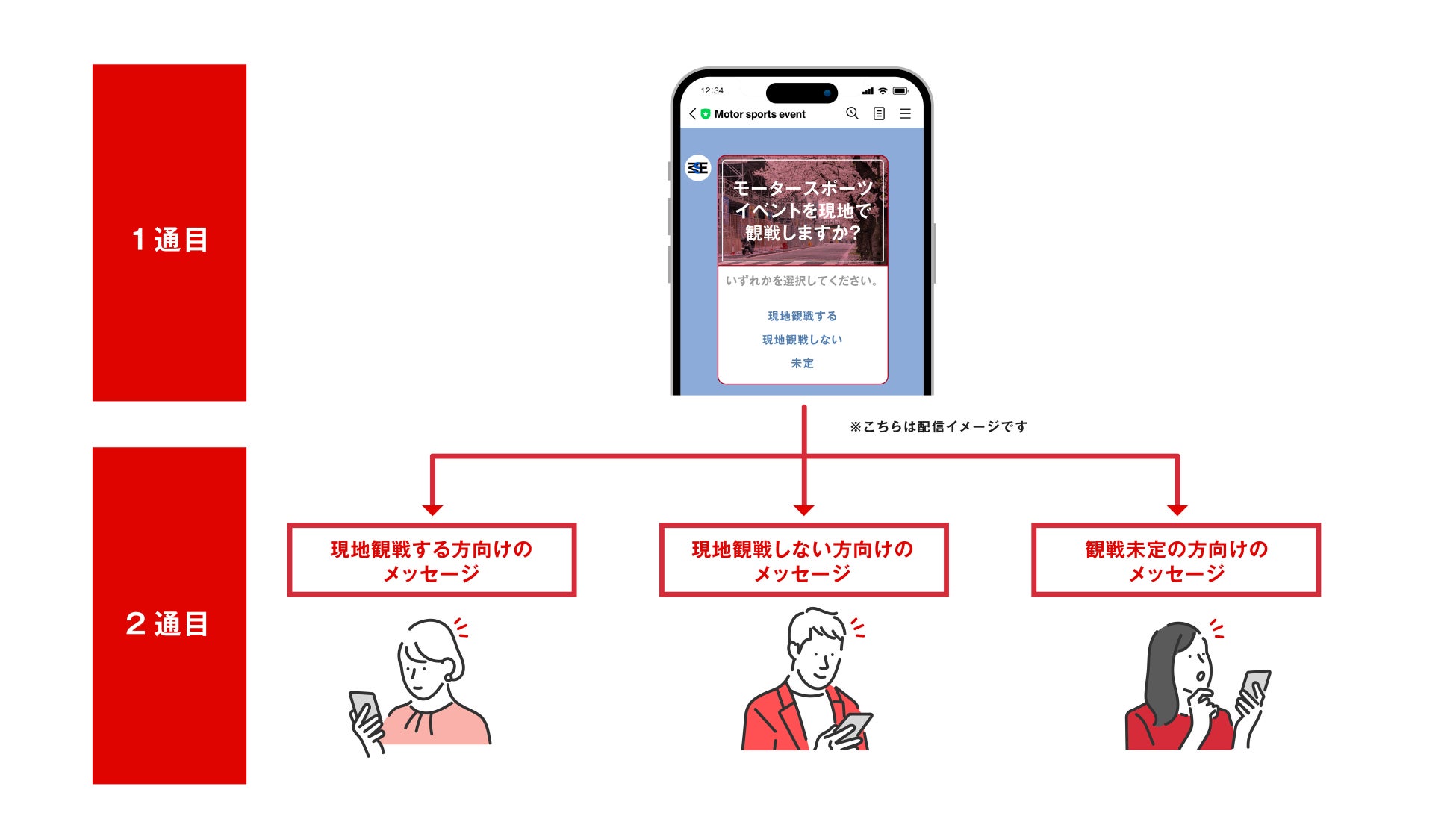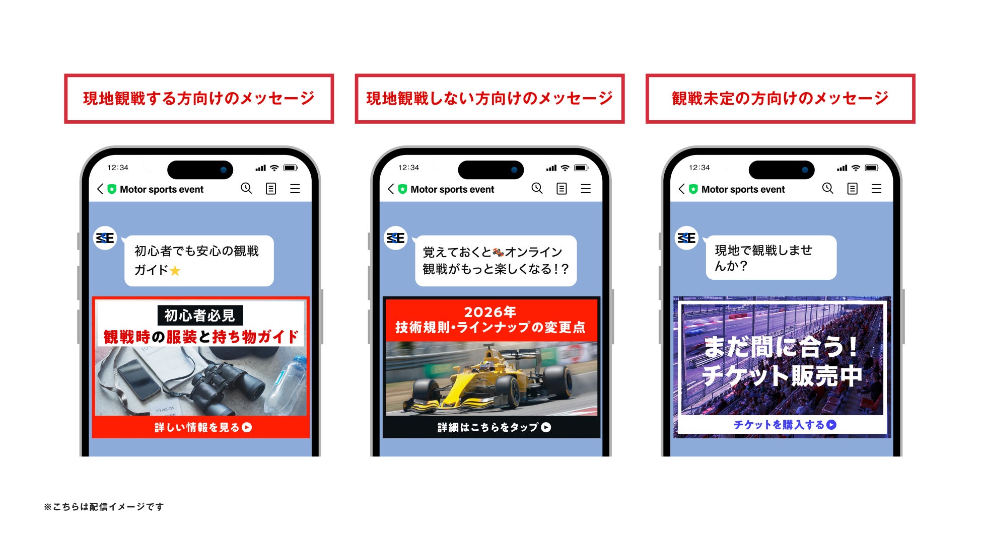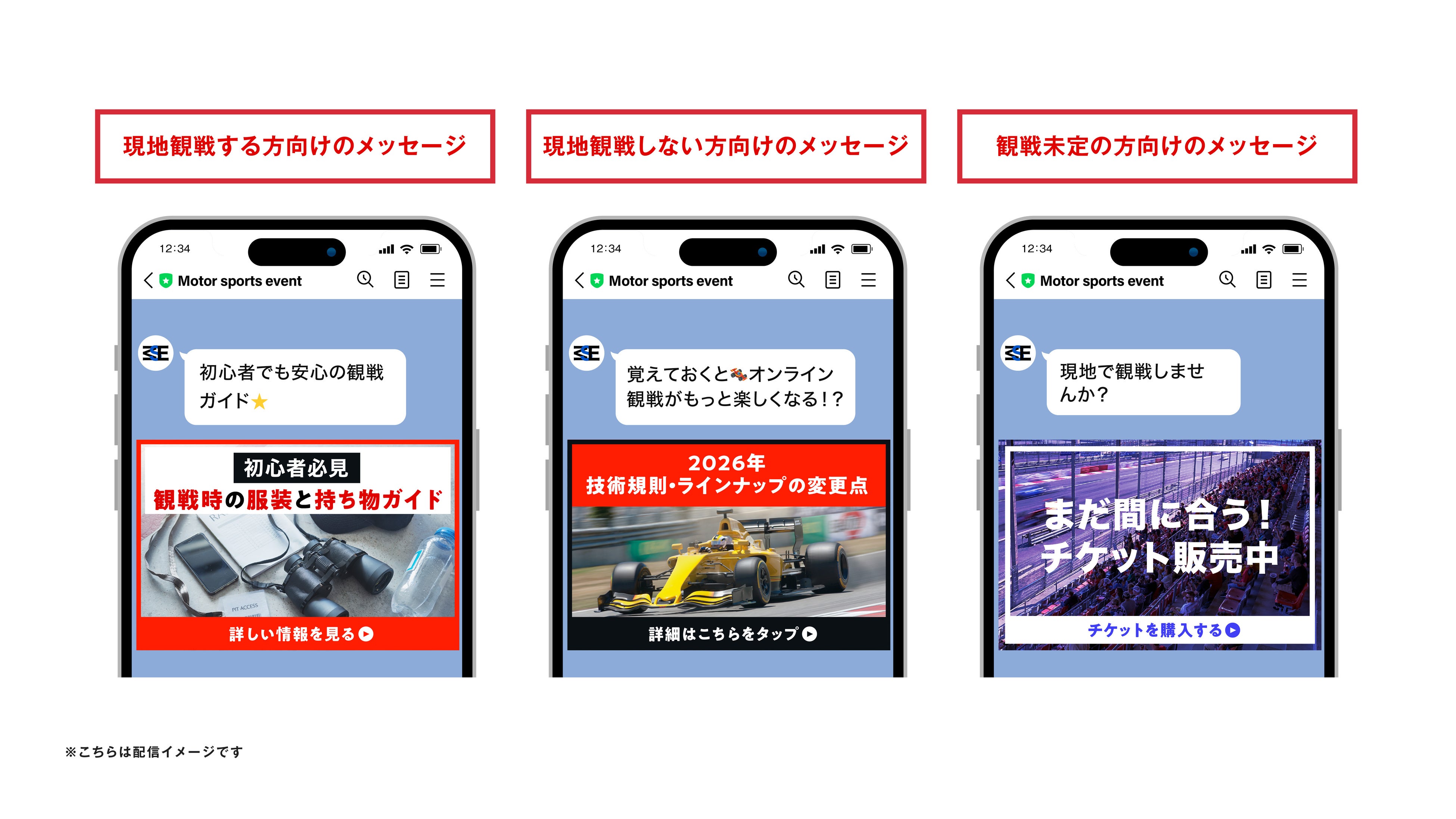 未定のユーザーには、チケット情報や現地観戦の魅力を訴求するコンテンツを配信。