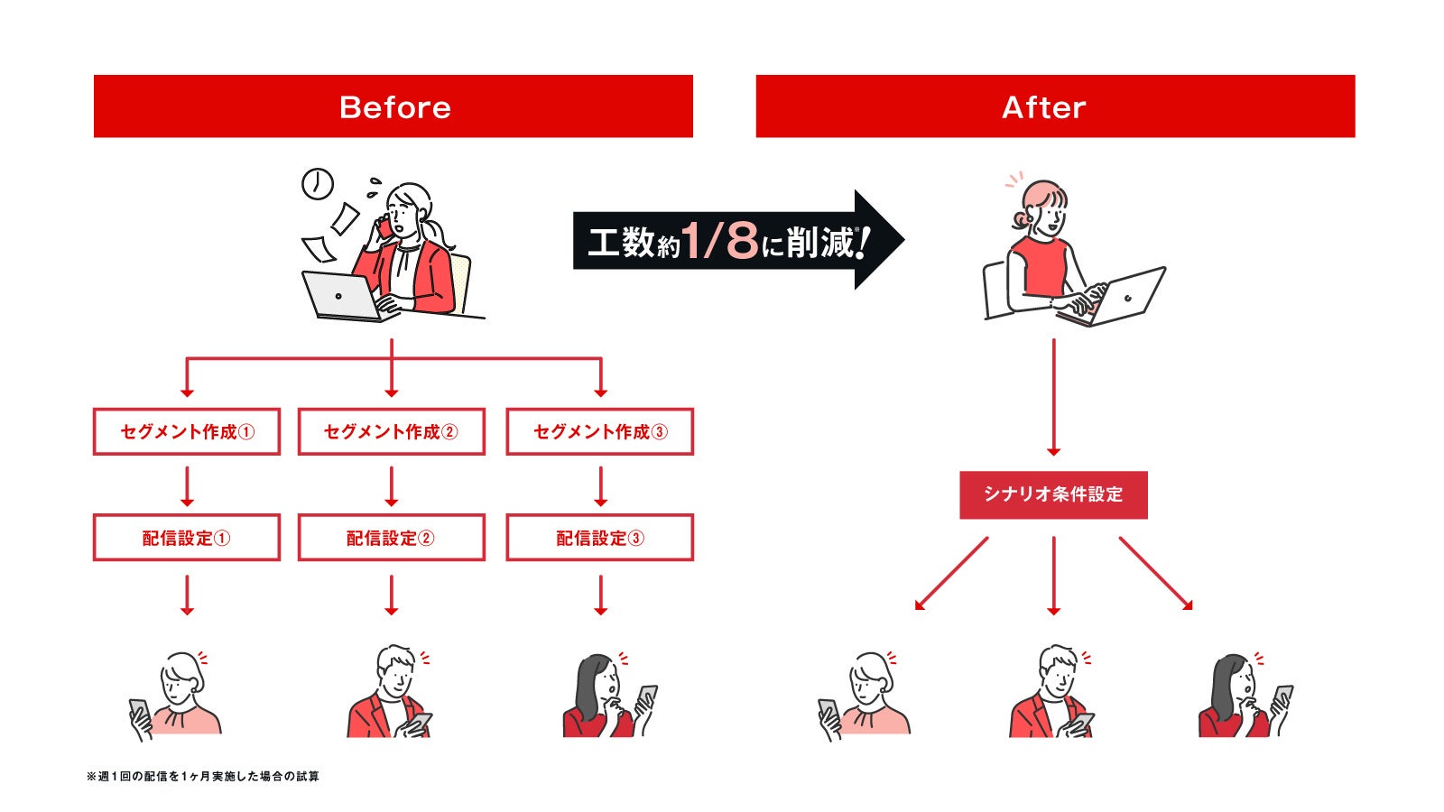 これまでは、セグメントごとに手動でユーザーを抽出し、配信設定を行う作業を繰り返す必要がありました。「シナリオ機能」を活用することで、初回の設定さえ完了すれば、その後の配信はすべて自動で実行されます。実際に、週1回の配信を1ヶ月間実施した場合の運用工数を試算すると、従来の手動運用と比較して約1/8削減できることがわかりました。さらに、この効果は運用期間が長くなるほど大きくなり、2ヶ月、3ヶ月と継続するほど工数圧縮の恩恵はより顕著になります。
