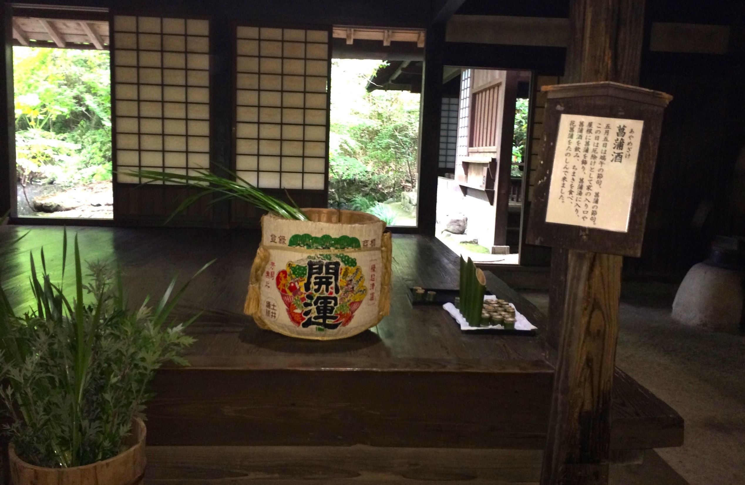加茂荘花鳥園では、新暦と旧暦の5月5日の端午の節句に、例年庄屋屋敷⼟間にて菖蒲酒を無料でふるまっております。ぜひご一献下さい。