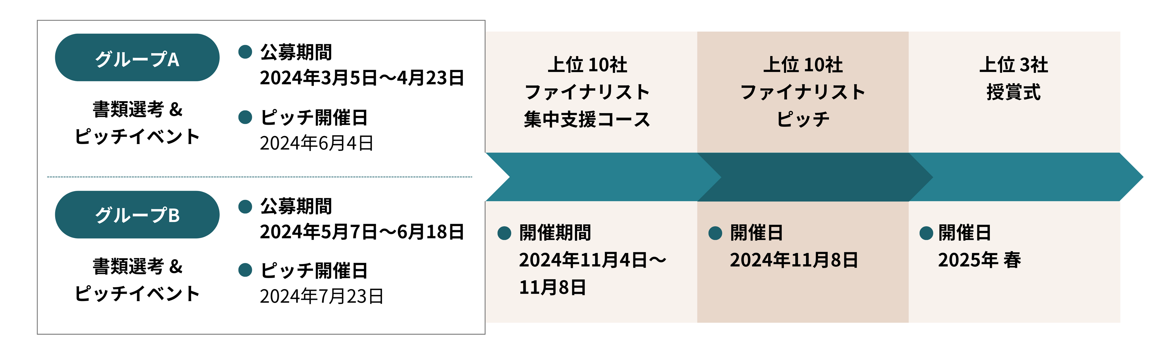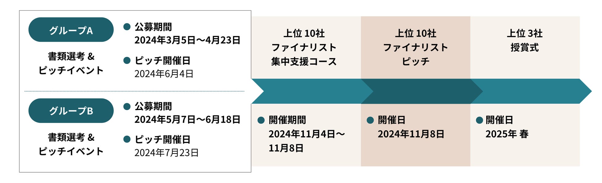 本プログラムは、2つのグループ(A・B)にて公募・書類選考を通して、ピッチイベントを行います。グループAは、サブテーマ①代替原材料・素材 ②製造工程を対象とし、グループBはサブテーマ③リテール ④消費者エンゲージメント を対象として公募します。 「ファイナリストピッチ」にて、上位3社を選出し、2025年春に開催予定の「授賞式」にて最優秀企業を発表・表彰します。