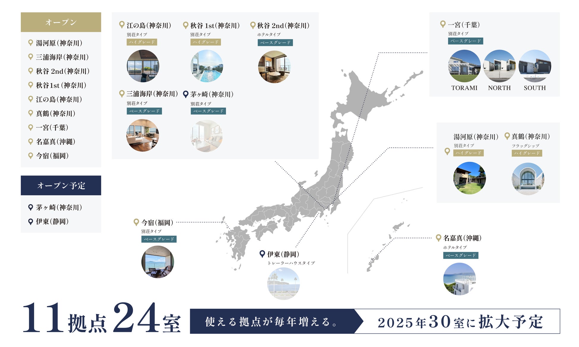 その他にもWITH SEAは日本全国に11拠点24室の様々なタイプの別荘があり、2025年には30室に拡大予定です。ビジネスからプライベートまで、ご利用用途に応じてお好みの別荘をご自由にご利用いただけます。新拠点のオープンにもご期待ください。