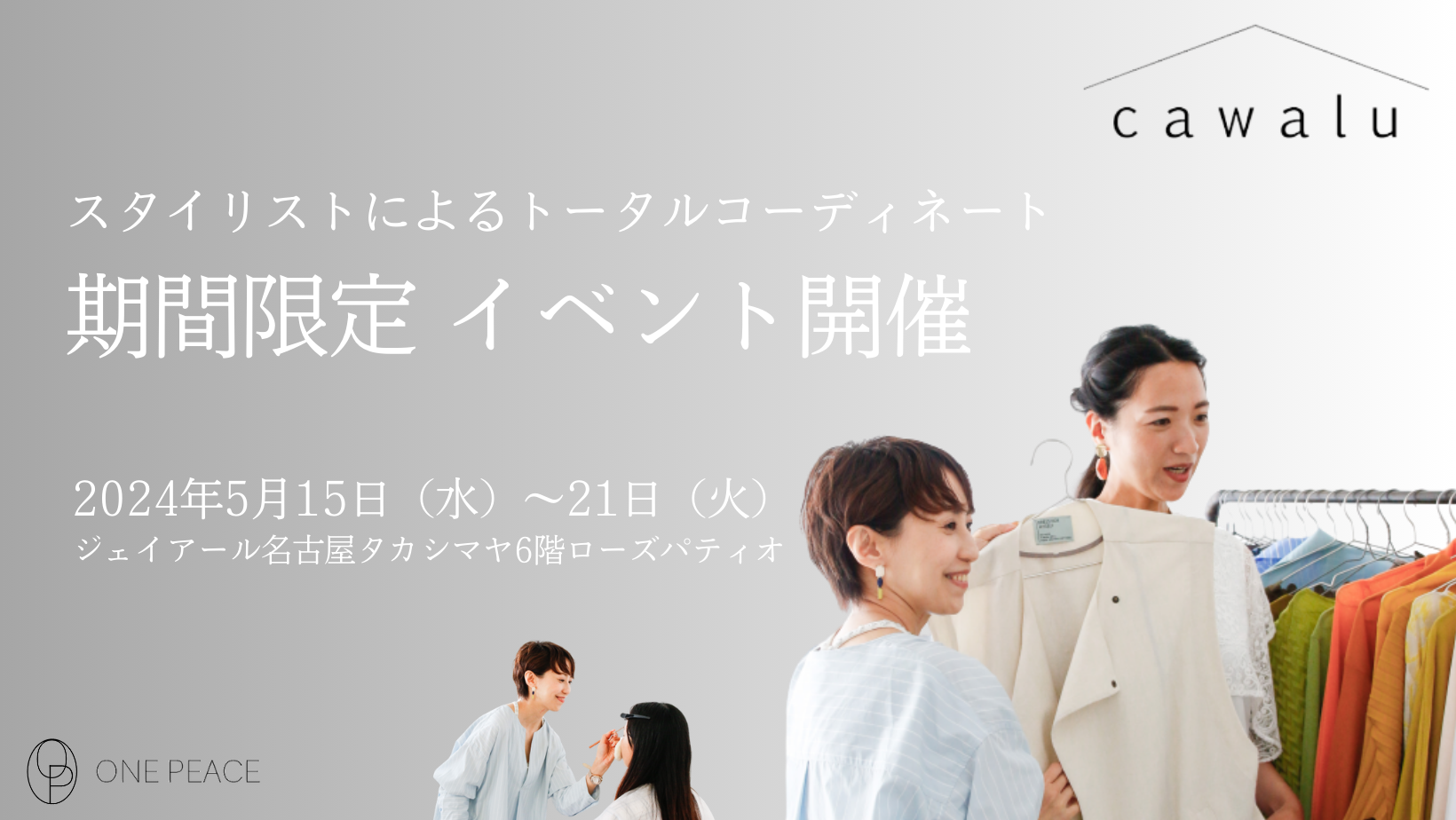 ファッションECを運営する株式会社ワンピースでは、個人が魅力的に輝くことをファッションや個人がより魅力的に輝くポイントは、洋服・メイク・ヘアのトータルバランスだと考え、「トータルコーディネートサロンcawalu(カワル)」を運営しています。