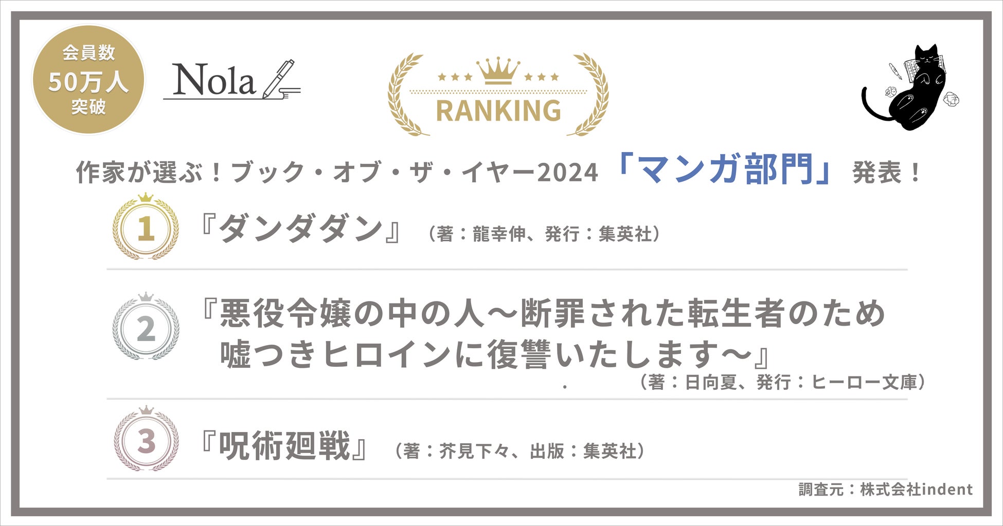 50万人を超える作家が登録する創作プラットフォーム「Nola(ノラ)」を運営する株式会社indent(本社:東京都千代田区、代表取締役社長:釜形 勇気、以下「indent)は、2024年12月5日(月)~12月15日(日)の期間、Nolaにご登録いただく作家の皆さまに向けて『読書事情にかんするアンケート』を実施し、小説・マンガ・webtoonの3部門に分けて『今年一番面白かった作品』を調査した結果を受け、このたび、『作家が選ぶ!ブック・オブ・ザ・イヤー2024』を発表いたしますことをお知らせいたします。