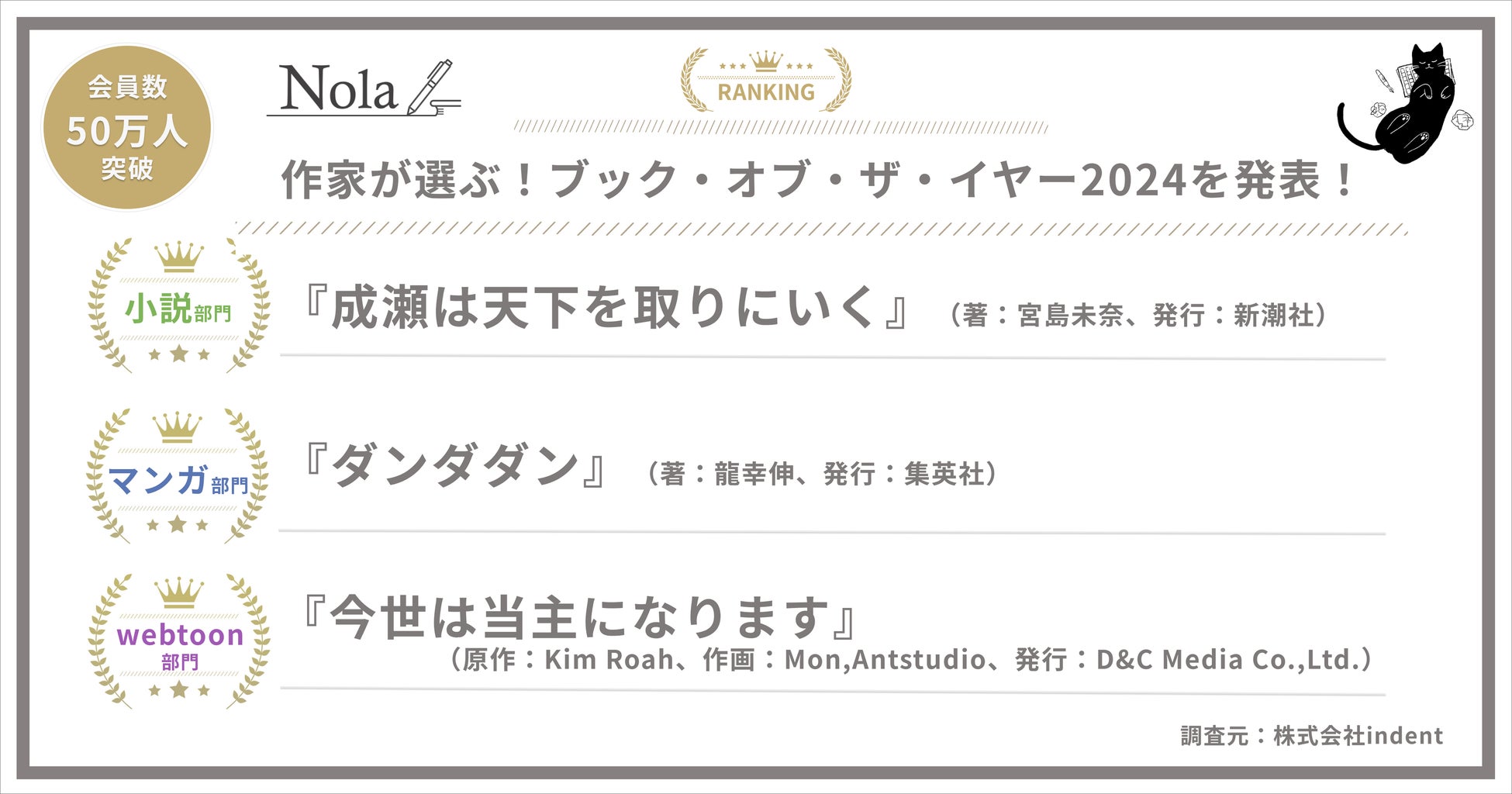 『作家が選ぶ!ブック・オブ・ザ・イヤー2024』を発表!(50万人を超える作家が登録する創作プラットフォーム「Nola」主催)