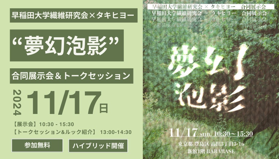 1751年創業の繊維商社タキヒヨー株式会社(本社:名古屋市西区、代表取締役 社長執行役員:滝 一夫)のオウンドメディア「__ for good(ブランク フォー グッド)」は、現存する中では日本で一番長い歴史を持つファッションサークル「早稲田大学繊維研究会」と合同で、次世代サステナブル素材ポリ乳酸(PLA)繊維を基にタキヒヨーが企画開発した素材を使用したコラボ展示会「夢幻泡影」を11月17日に開催します。