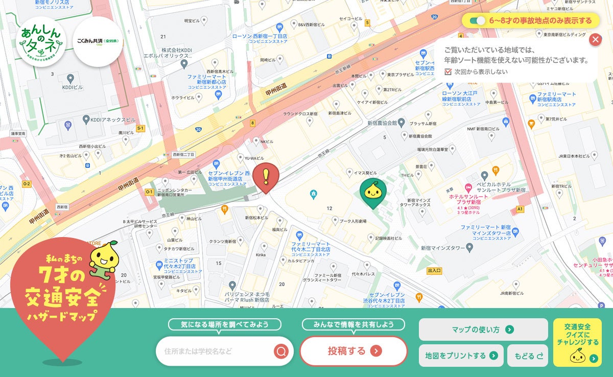こくみん共済 coop〈全労済〉(全国労働者共済生活協同組合連合会 代表理事 理事長:廣田 政巳)は、未来ある子どもたちを交通事故から守っていく取り組み「7才の交通安全プロジェクト」の一環として金沢大学 藤生准教授と共同で開発した「私のまちの7才の交通安全ハザードマップ」に投稿機能を追加しました。