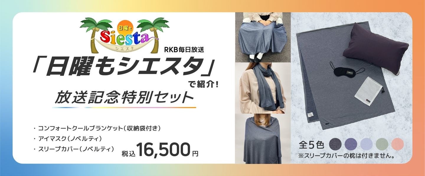 2022年5月29日(日)12:54より放送されるRKB毎日放送「日曜もシエスタ」にて、当社が紹介されることとなりました。放送を記念して、夏を快適に過ごすためのリカバリーアイテム3点セットを販売します。セット内容は、2022年4月20日(水)より販売開始した夏限定リカバリーウェアの『COMFORT COOL』シリーズと同じ、接触冷感と高通気性が特徴の素材を使用した『コンフォートクール ブランケット(収納袋付き)』と、眼精疲労のケアができる『アイマスク(ノベルティ)』、滑らかでしなやかな肌触りが特徴の『COMFORT PUNCH』シリーズの生地を使用した、睡眠の質をさらに高めるための『スリープカバー(ノベルティ)』です。