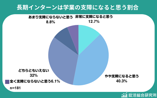 長期インターンが学業に「非常に支障になると思う」(12.7%)と「やや支障になると思う」(40.3%)と答えた就活生はあわせて53.0%でした。過半数の学生が、時間の使い方や両立の難しさを懸念している様子がうかがえます。