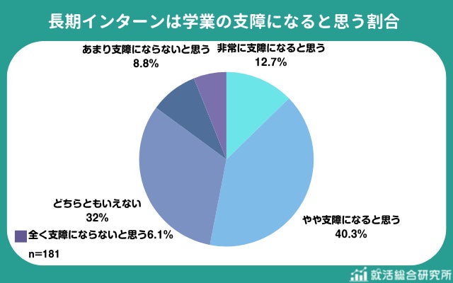 一方で、「あまり支障にならないと思う」(8.8%)、「全く支障にならないと思う」(6.1%)と回答した学生は14.9%にとどまり、学業とインターンを問題なく両立できると考える層は少数派でした。
