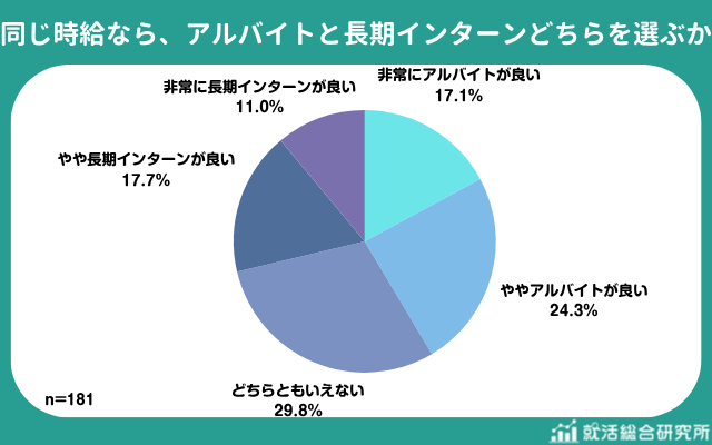 同じ時給で働くなら「非常に長期インターンが良い」(11.0%)と「やや長期インターンが良い」(17.7%)と答えた就活生はあわせて28.7%でした。就活生の約3割が、アルバイトよりもキャリアを見据えて長期インターンを希望する傾向が見られました。