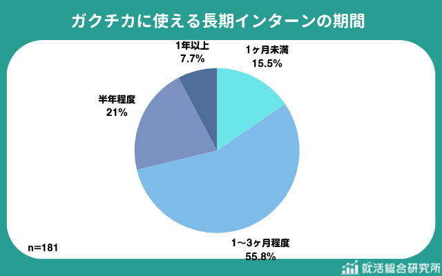 また、「1ヶ月未満」(15.5%)と回答した学生も一定数おり、短期間であっても内容次第でガクチカとして評価されると感じている学生も少なくないようです。