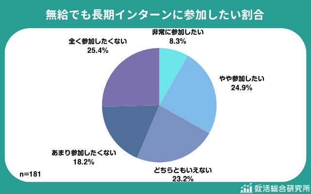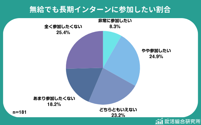 無給でも長期インターンに「非常に参加したい」(8.3%)、「やや参加したい」(24.9%)と回答した就活生はあわせて33.2%でした。報酬よりも実務経験やスキル習得を重視する学生が一定数存在しており、「学び優先」の姿勢がうかがえます。
