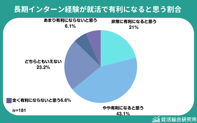 長期インターンの経験が「非常に有利になると思う」(21.0%)、「やや有利になると思う」(43.1%)と回答した学生はあわせて64.1%でした。6割以上の就活生が、長期インターンの経験が評価につながると考えていることがうかがえます。
