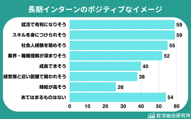 長期インターンのポジティブなイメージは「就活で有利になりそう」「スキルを身につけられそう」が59人と最も多くなりました。多くの就活生が就職活動や将来のキャリア形成に直結する経験として捉えられていることが分かりました。