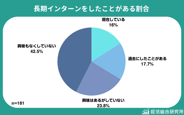 長期インターンを「現在している」(16.0%)、「過去にしたことがある」(17.7%)と回答した就活生はあわせて33.7%でした。3人に1人の学生が長期インターンを経験しており、大学生の間で長期インターンが着実に浸透していることが明らかになりました。