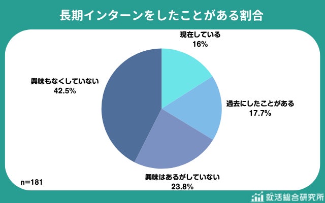 長期インターンを「現在している」(16.0%)、「過去にしたことがある」(17.7%)と答えた就活生はあわせて33.7%でした。3人に1人の学生が長期インターンを経験しており、長期インターンの浸透が明らかになりました。
