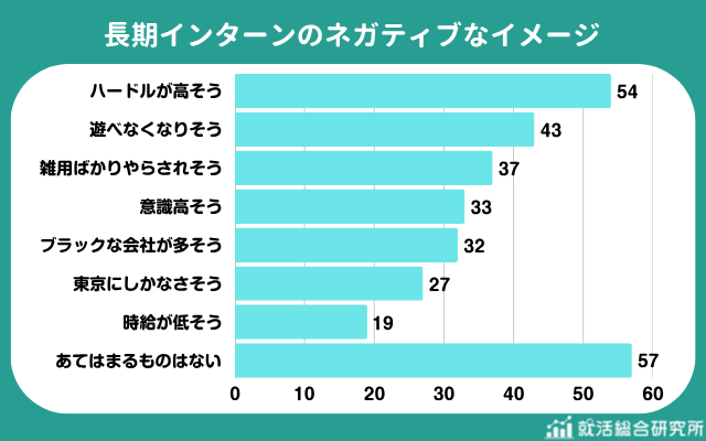 長期インターンのネガティブなイメージは「ハードルが高そう」が54人と最多でした。