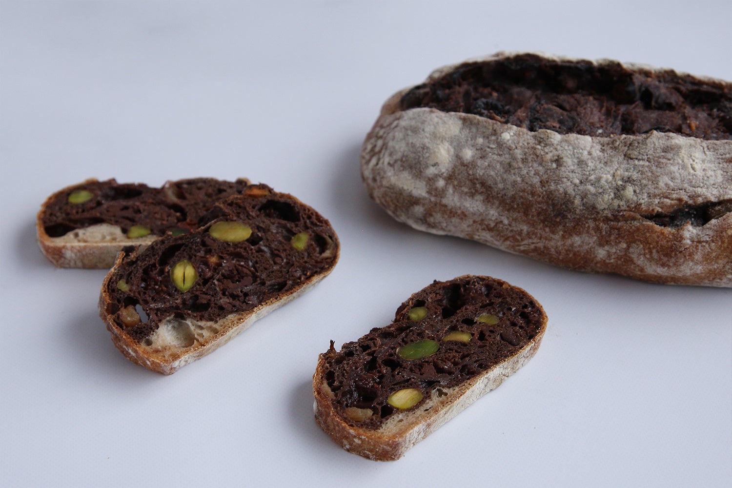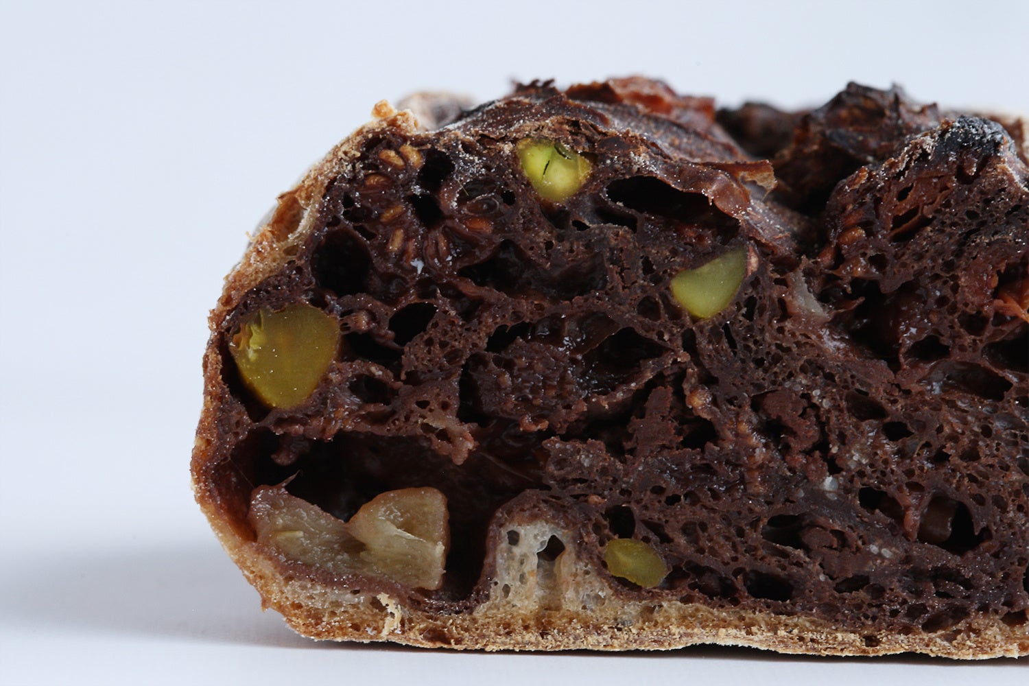 ヴァローナ社製のカカオ64%の「マンジャリ」とカカオ68%の「ニアンボ」を生地に練り込み、洋酒漬けしたラズベリーとサワーチェリー、ピスタチオを入れて焼きあげます。 チョコレートの華やかな酸味、甘酸っぱくジューシーなフルーツが相性抜群!ピスタチオの食感が加わって、贅沢で複雑な美味しさを生み出しています。