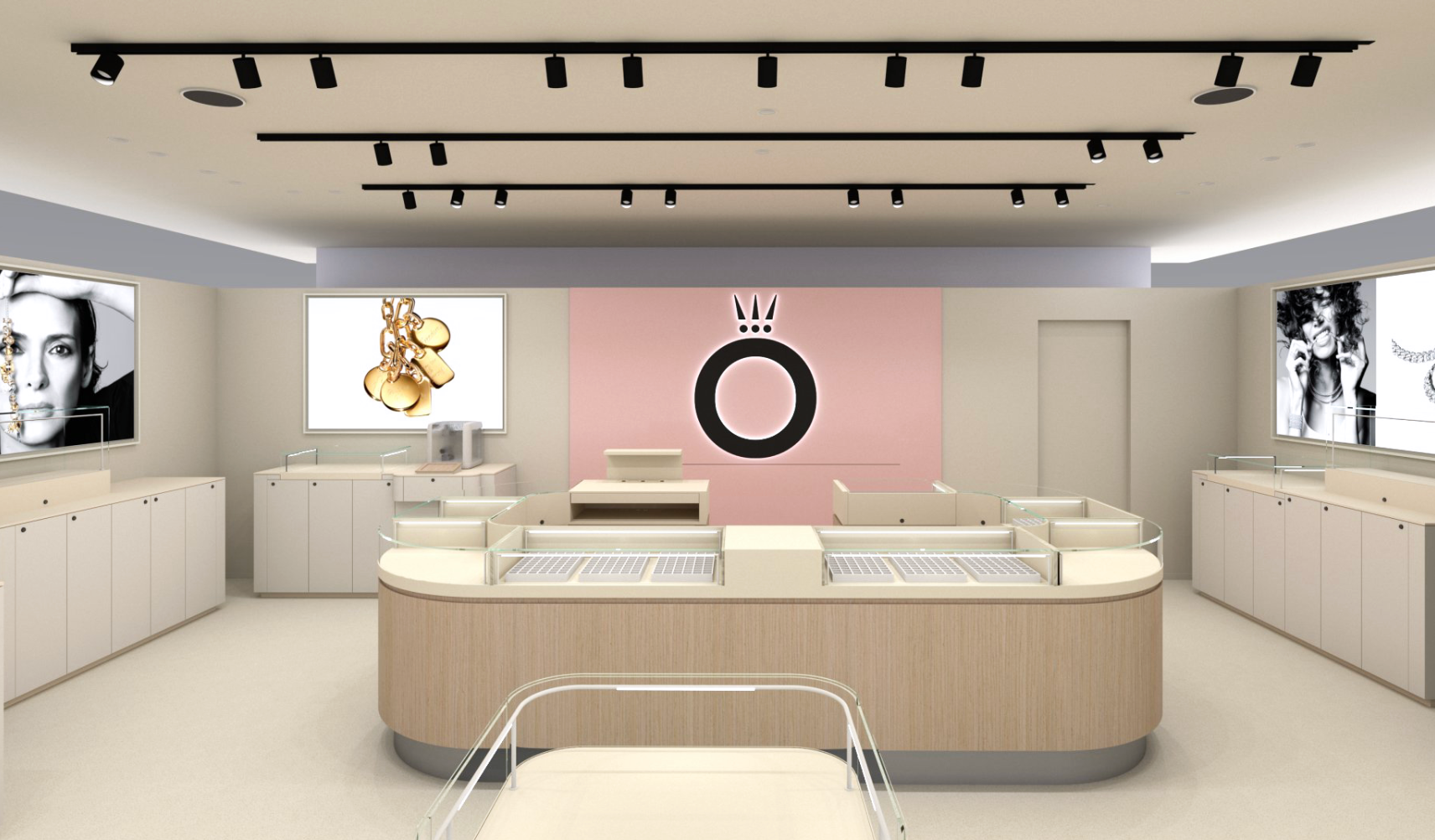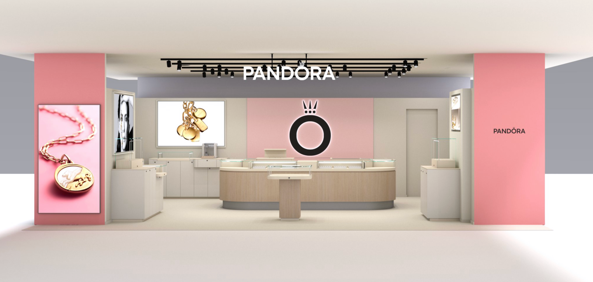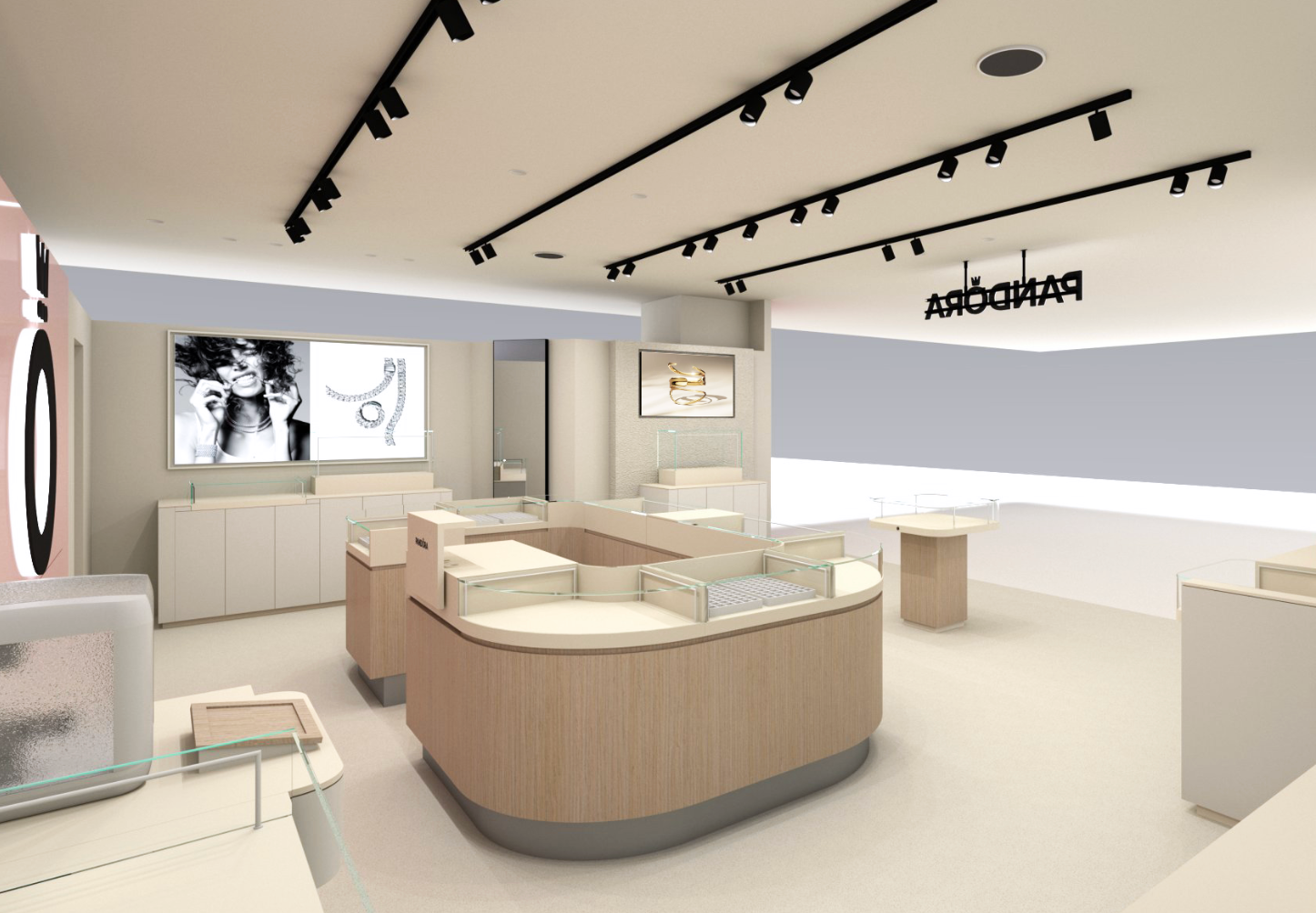 日本国内で56店舗目となるPandora福屋広島駅前店は、開放感のあるファサードが特徴で、ホワイト/ベージュを基調にピンクをアクセントとして取り入れつつ、ブラックのサインとライティングでコントラストを演出した、上質で洗練された空間となっています。
