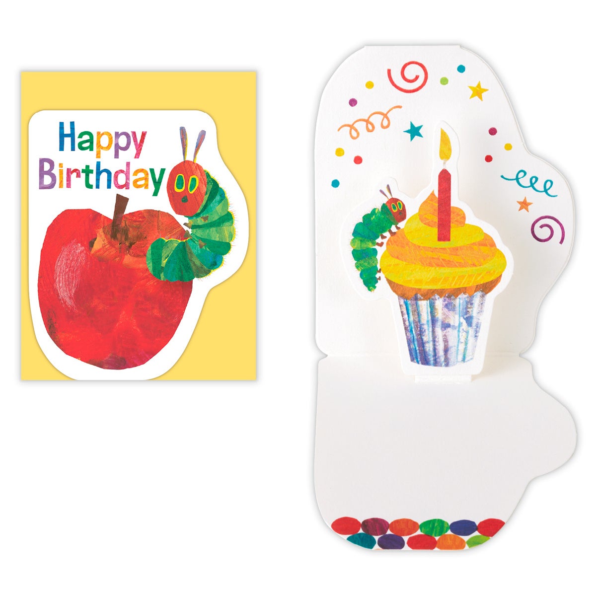 存在感あるダイカットタイプの「HCカット・バースデーリンゴ」は、カードを開くとあおむしとカップケーキがポップアップ。誕生日のお祝いにぴったりのデザインです。