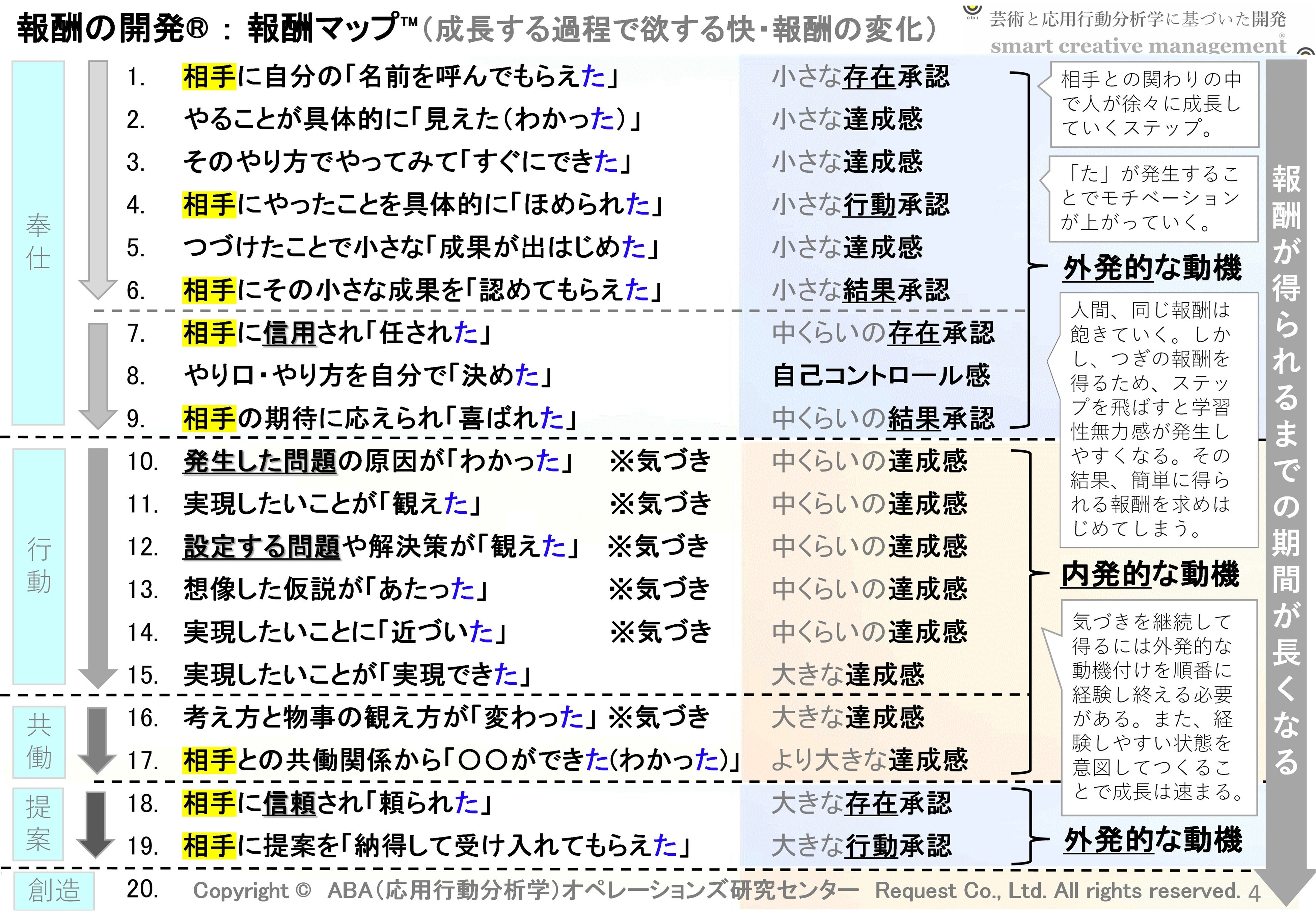 「有能感を上げる」「自己肯定感を上げる」ために、できることを増やすわけではなく、特定の相手の「問題を解決することで達成感を得ていく」ように変えていく。そのために、報酬マップの中で、今、自分がどこの報酬を欲しているのか?を観ていくことと進めやすくなります。