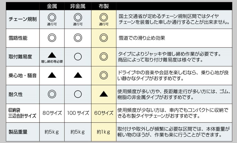 布製タイヤチェーンと他のタイヤチェーンとの比較