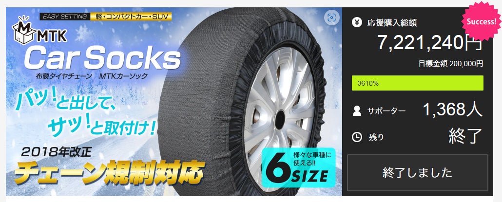 2023年12月下旬までクラウドファンディングサイトMakuakeにて先行販売を行い、1000名以上の支援を得て目標金額の『3610%』を達成した布製タイヤチェーン『MTKカーソックス』が主要ECモールにて一般販売を開始しました。