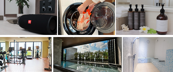 各客室に乾燥機付洗濯機(洗剤・柔軟剤付き)、電子レンジ、キッチン・調理器具、炊飯器